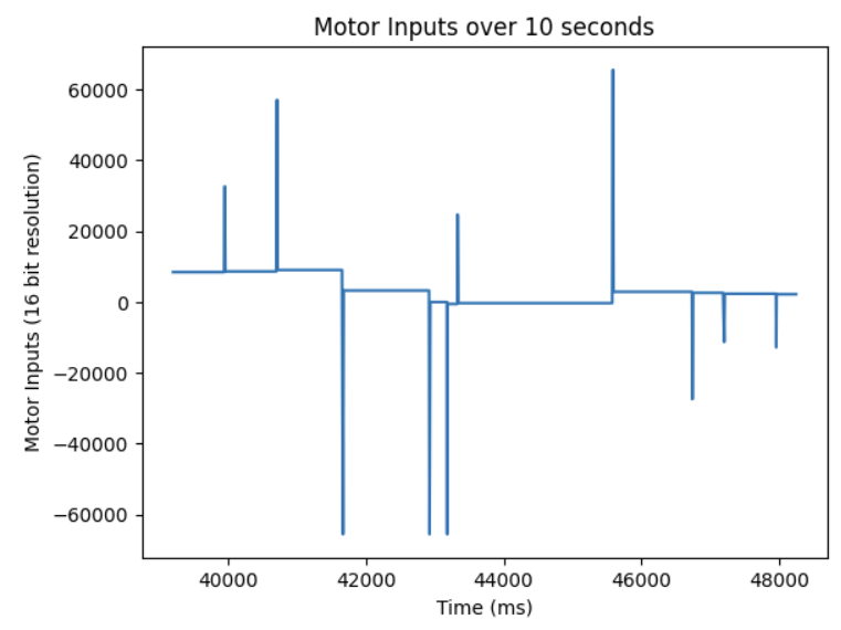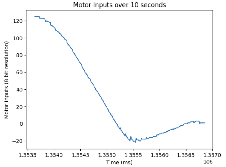 I then used the simple linear extrapolation algorithm and got the data below with 50/0/30 Kp/Ki/Kd. I also couldn't smooth out the motor inputs and I suspect it is for the same reason why