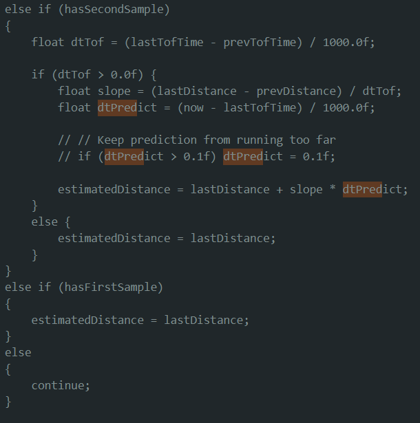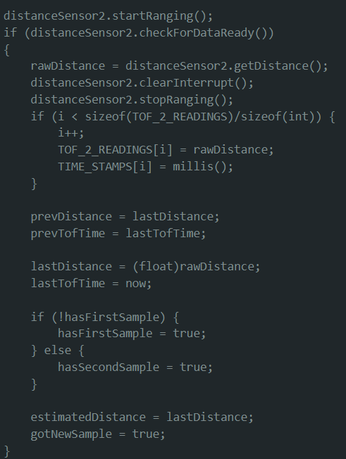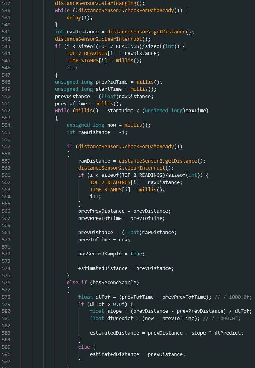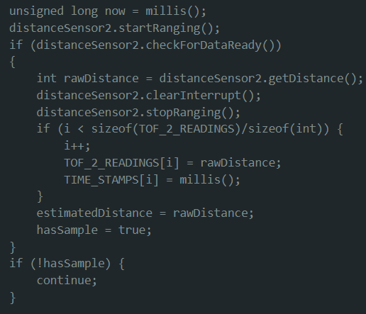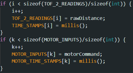 I then sent data back with these two if statements. I stored the data in arrays before sending them back over bluetooth with for loop commands like previous labs. Before the while loop where my PID controlled motor commands are, I initialize i and k to 0 and every time the loop completes, I update them. I used two separate index counters so that I could decouple them later on during extrapolation.