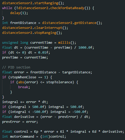 I then started programming the PID control command. The main part of my PID control command is in the photo below where the robot first waits for new sensor data, then calculates the PID controlled command.