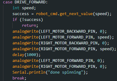 I first tested how to control the robot over bluetooth with my "DRIVE_FORWARD" command. It takes an input of the PWM signal I want the motors to spin at and spins them for 1 second.