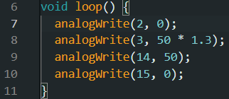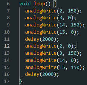 Since I need analog pins, I am using two for each motor driver. One side of motors will be controlled by pins A2 and A3. The other side of motors will be controlled by pins A14 and A15.
