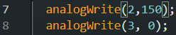 Using the analogWrite commands below, I ran the motor at about a 60% duty cycle by using 150/255 for the PWM number.