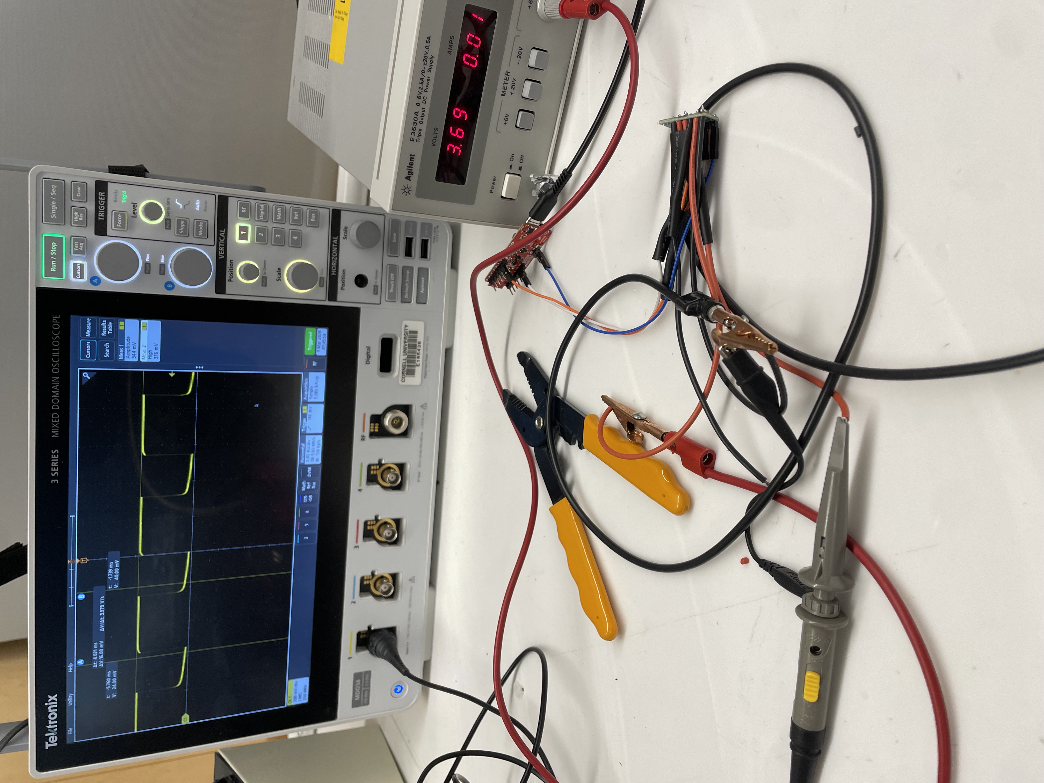 Hooking it up to an oscilloscope, you can see how the motor is on for about 60% of the time. Using PWM, a 60% duty cycle means the motor is on for 60% of the time which basically emulates the motor spinning at 60% of it's max power.