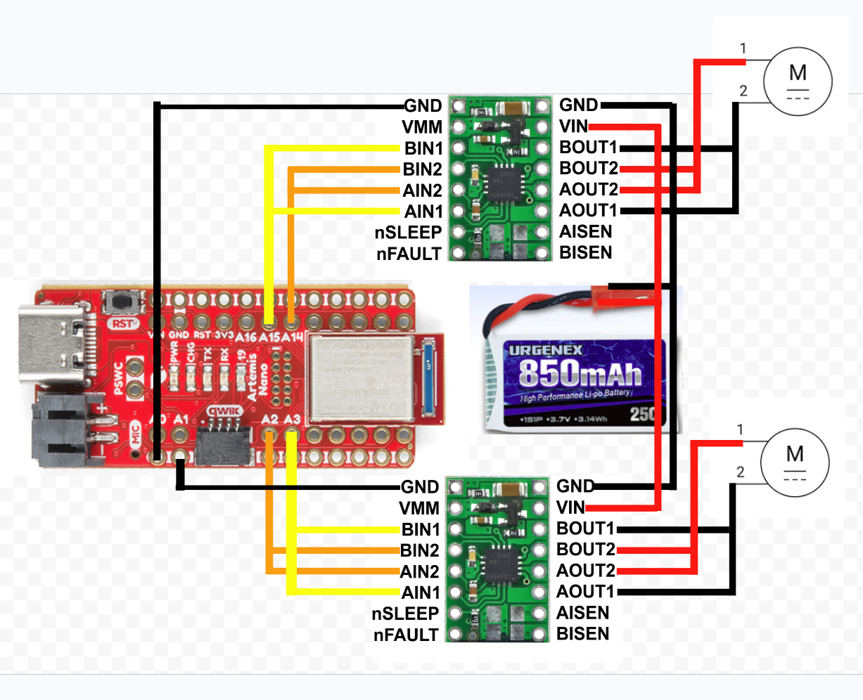 I referenced Aidan Derocher's website: https://boltstrike.github.io/pages/lab4.html, for wiring help for the motor drivers and Artemis.