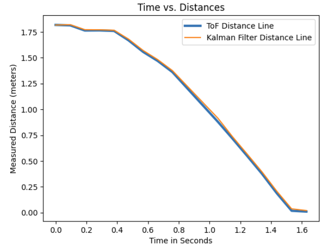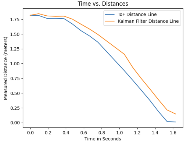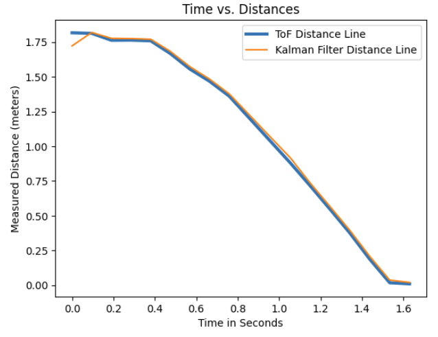 With my position, velocity, and sensor noise standard deviations set to 0.5 meters, I got the following data with the ToF data from me getting the steady state speed above.