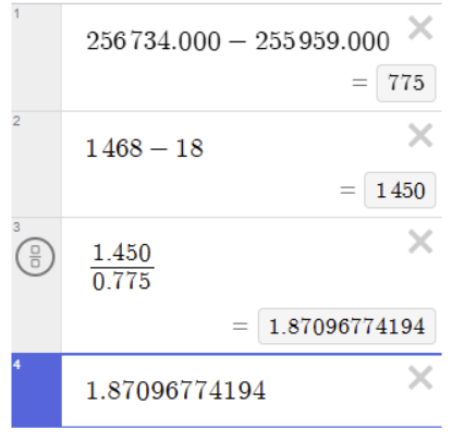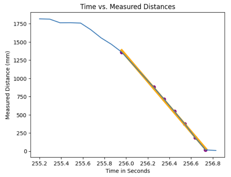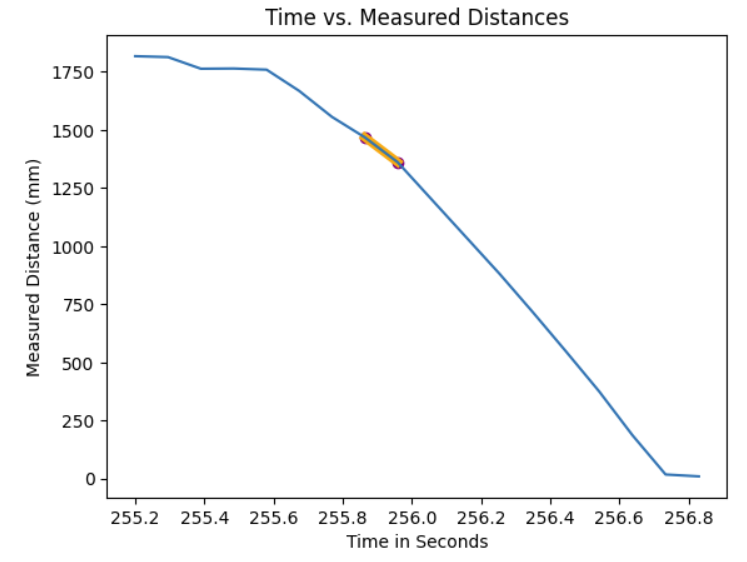 I then used sent the ToF readings over bluetooth and made the plot below. The yellow line roughly shows the steady state speed of 1.87096774194 meters per second. I got 1.87 m/s by taking the first and last point on the line and subtracting the distances and getting the difference in time and dividing the two as seen in my calculations.