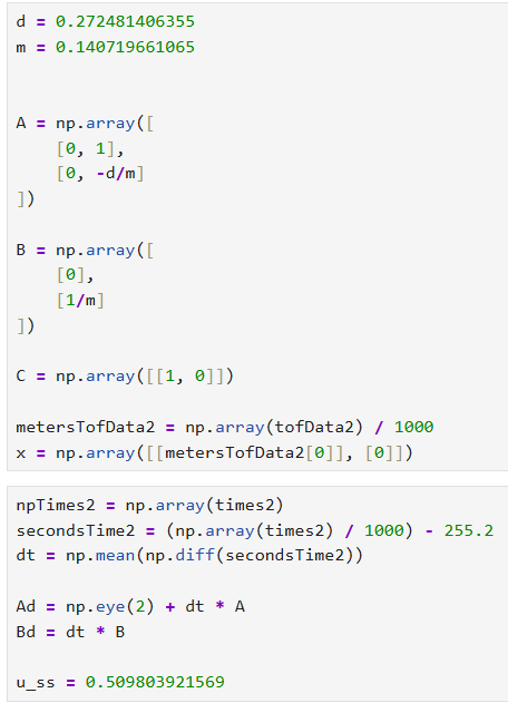 I then used the state space equations from lecture to get my A and B matrices. I made C [1 0] because the "position" values are positive distances from the wall directly from the ToF sensor.