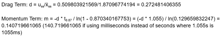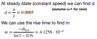 The yellow line shown in the graph below shows an estimate of the speed at 87.0340167753% of the steady state speed. I got that speed of 1.62837837838 m/s by getting the difference in distances between the two points of the line and then getting the difference in times between the two points and dividing them to get the speed of 1.62837837838 m/s, which took 1.055 seconds to get to. So my rise time was 1.055 seconds, and the speed at 90% rise time was 1.62837837838 m/s.