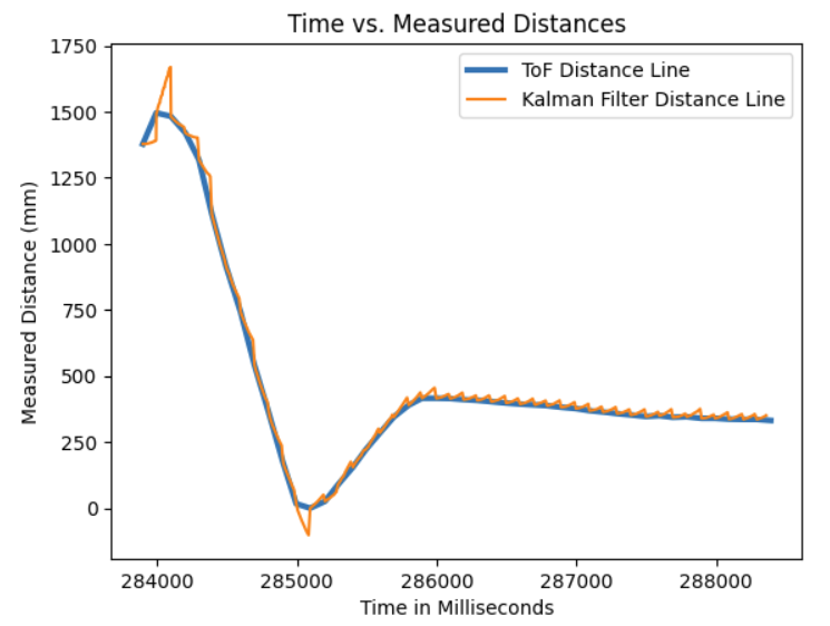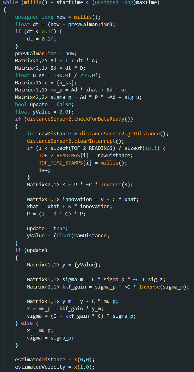 I then converted the KF Python code to C that can choose to use the measurement data (if there is new measurement data) to update the filter. If there is no measurement data from the ToF sensor ready, it will just skip the update step and rely solely on the model.