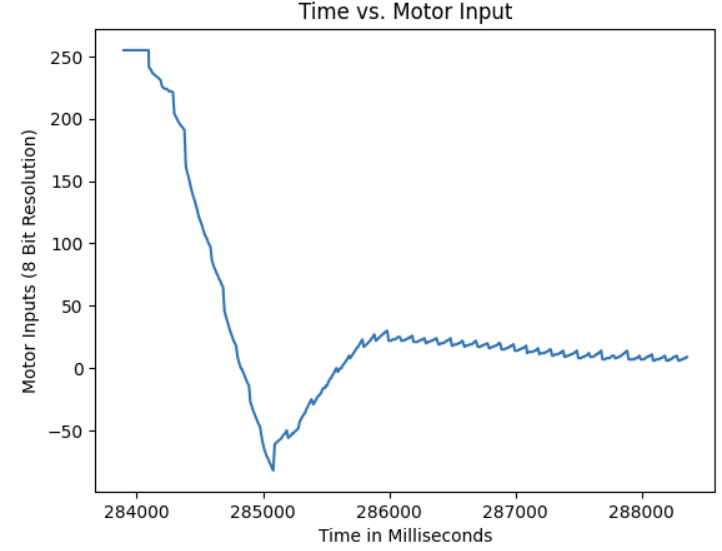 I switched back to using millimeters so I had to change my m term to 140.719661065, and I also had to use much larger variances for the noise. I ran this Kalman Filter PID code with 100 for the process noise variances, sensor noise variance, and state uncertainty and got the video and data below.