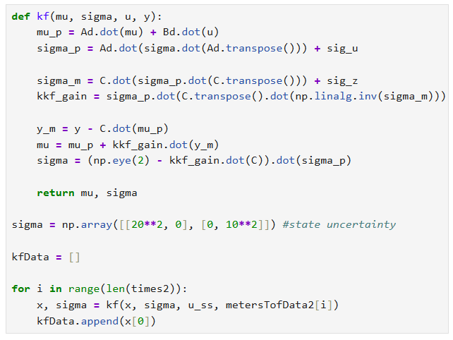 Increasing or decreasing state uncertainty only really changed the initial values for the Kalman Filter as I changed the values from sigma = np.array([[0.1**2, 0], [0, 0.1**2]]) to sigma = np.array([[20**2, 0], [0, 20**2]]) and got this: